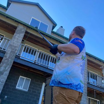 We start by applying our soap, algae and moss cleaner directly to the surface of the siding using low pressure